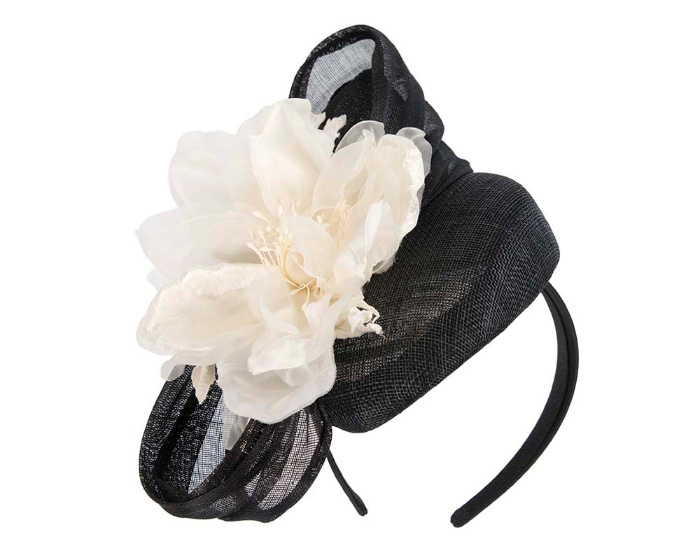 Exquisite black pillbox topped with large hand-made contrast cream silk flower and decorated with silk abaca loops. Simple and elegant choice for your spring racing outfit.