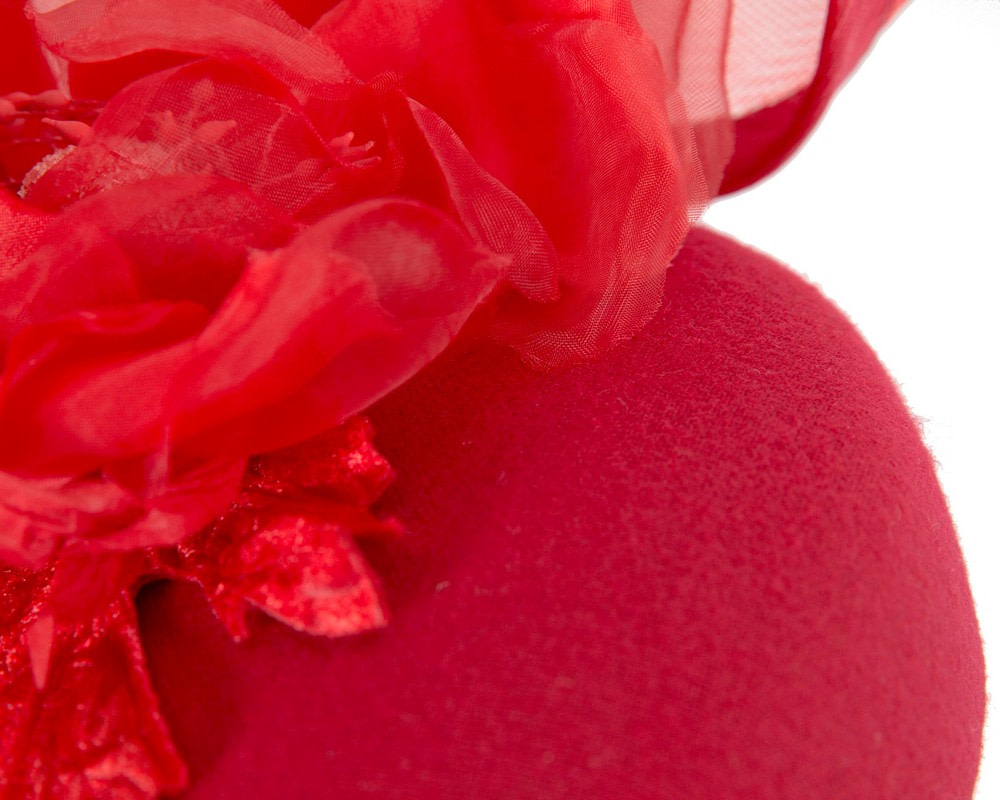Woolen red pillbox embellished with large crinoline twist and matching silk flower. Perfect choice for autumn and winter racing outfits.