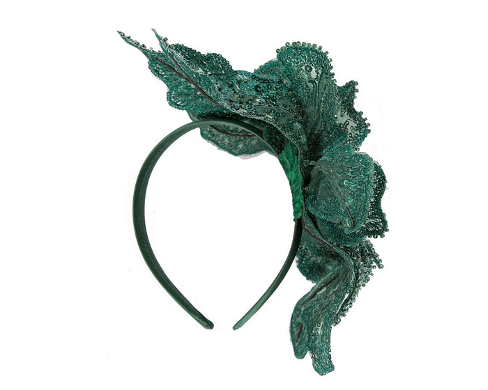 Delicate dark green lace sculpture covered in sparkling sequins and placed on the headband for comfortable wear.