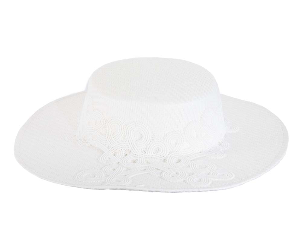 Wide brim white boater hat with rich white lace from latest Max Alexander collection. Shine at next racing meeting in this stylish fashion hat!